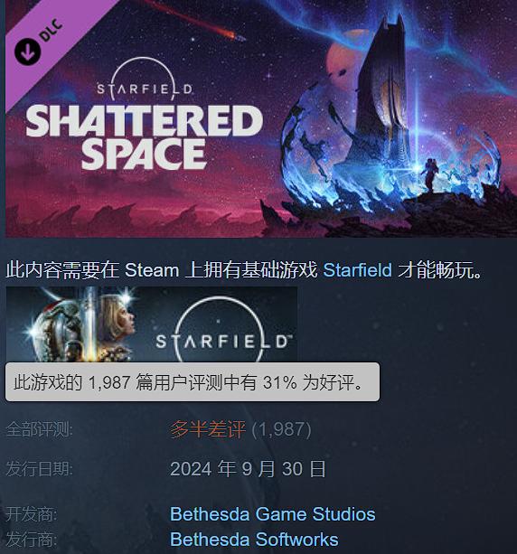 《星空》DLC口碑翻車。《星空》DLC“破碎空間”現已正式推出,然而Steam評價“多半差評”,截至撰稿好評率只有31%,口碑大翻車,在MC上的媒體評分也只有63分。給出差評的玩家指出,DLC各種“通馬桶”任務還是和本體中的一樣無聊,沒有瓦魯專屬新飛船模塊和新載具,在放大了本體缺點的同時,還丟失了本體原有的一些優點。