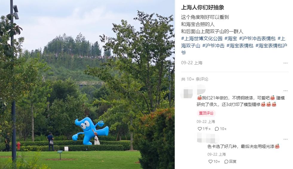 海寶在網上火了之後,很快有人跑到世博板塊的地鐵站、公園,找到尚存的海寶雕像,擺出表情包裏的姿勢,合影留念。