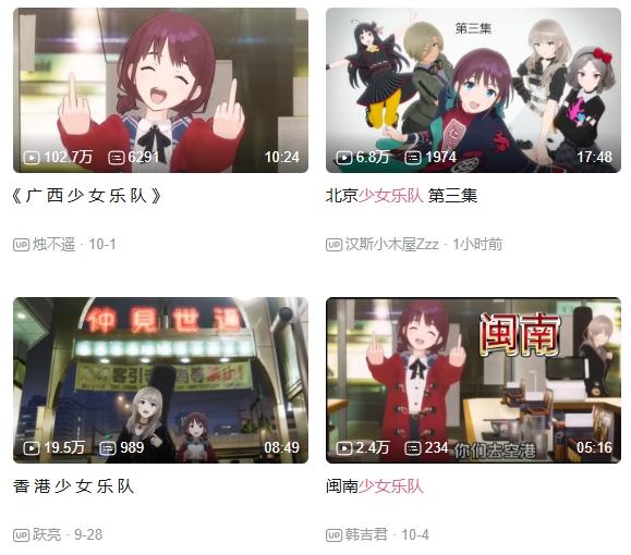 與海寶翻紅的情緒類似,最近B站上出現了一大批“XX少女樂隊”的二創。它們主要都是基於樂隊番《哭泣少女樂隊》的第一集改編,給對話、配樂、劇情加入濃重的地域色彩。