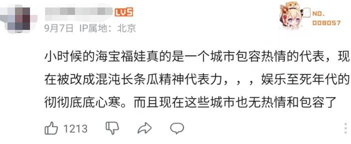 當然,需要說明的是,用吉祥物指代某個地方的人,依然沒有逃出地域黑的範疇,只是表現的方式更加娛樂化了。就像在不喜歡新式海寶表情包的評論裏,有人會說,海寶曾經是上海包容熱情的象徵,現在海寶的意義被解構了,城市精神也不像從前,這未嘗不是一種諷刺。