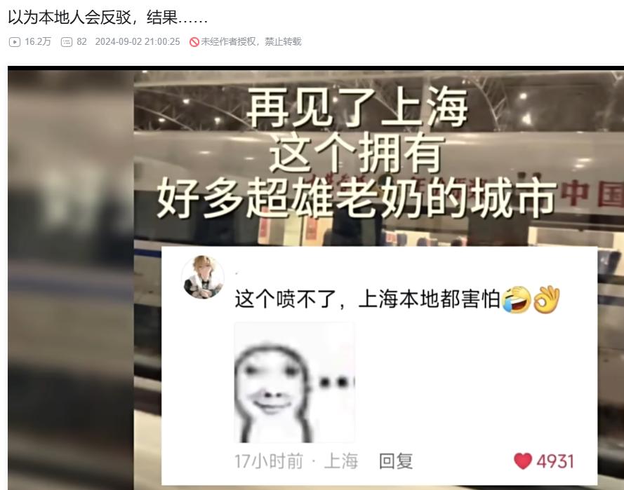 而海寶表情包之所以能廣泛傳播,是因爲它沒那麼強的攻擊性,而一個地域梗有沒有過度的惡意,很大程度上取決於,玩梗、傳播的主體是誰。“滬爺衝擊”是上海高校梗,又搭上了上海的吉祥物,由上海人強化演繹,其身份認同感是要強於刻板印象的部分的。