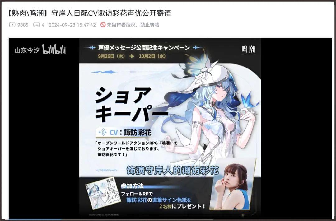 手遊角色裏面大家比較熟悉的,可能是《陰陽師》裏的“雪女”、“骨女”、“跳跳妹妹”、“螢草”……還有《鳴潮》新出的“守岸人”的日配,都是他老婆配音的。