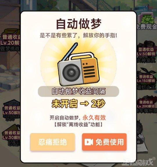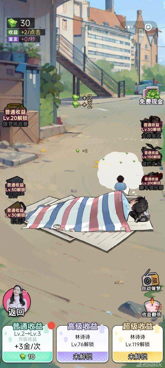 總之遊戲裏最重要的事情就是賺錢,而賺錢在遊戲裏統稱爲“做夢”,就是男主大白天的躺廢墟里睡覺做夢賺錢。這就是非常直白的告訴玩家了,花錢纔有資格做舔狗,不然就只能做白日夢。