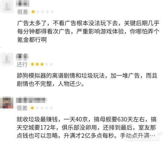 有網友吐槽,廣告太多了,不看廣告根本沒法玩下去,關鍵是後期幾乎每分鐘都得看次廣告,嚴重影響遊戲體驗。還有網友直接開噴表示,這就是舔狗模擬器,離譜劇情和垃圾玩法,加一堆廣告。還有網友算了一下廣告收益後吐槽, 975的形象分,掛機5分鐘才能賺5分,這就要16個小時,還有就是就算廣告最低30秒一個,要將近看兩個小時的廣告,這合理嗎?