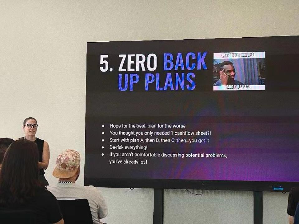 關於“去風險化”,這也非常重要,這些去風險化的策略也會幫助你制定備用計劃。合作伙伴通常會問:“你們項目的風險是什麼?”如果你回答說“沒有風險,請投資我們”,他們可能會覺得你不夠真誠。每個項目都有風險。不論規模大小,你都應盡力降低這些風險。