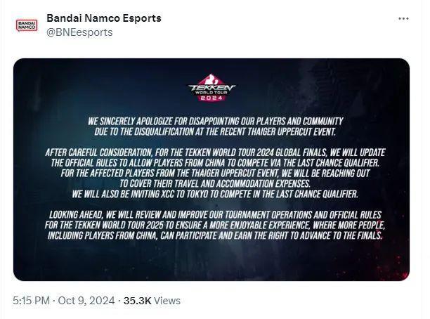 隨着事件的進一步發酵,今日(10月9日),萬代南夢宮中國發布關於“Thaiger UpperCut 2024 賽事選手失去參賽資格事件的公告”。