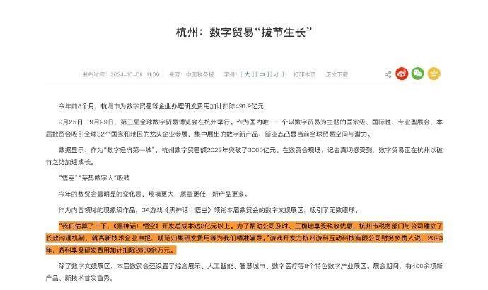 近日,在國家稅務總局浙江省稅務局發佈的新聞動態中,來自遊科互動的負責人透露,《黑神話:悟空》的開發總成本超過3億元,原文如下: