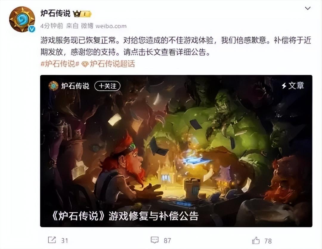 暴雪《爐石傳說》國服於9月25日迴歸後,不少玩家遇到了各種服務問題,如異常排隊、匹配困難與斷線等。9月26日,官方因遊戲體驗致歉,向所有玩家補償10包卡包。然而問題仍未徹底解決,隨後在9月29日、10月4日官方又接連發布致歉補償公告。