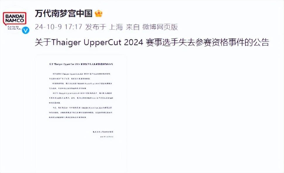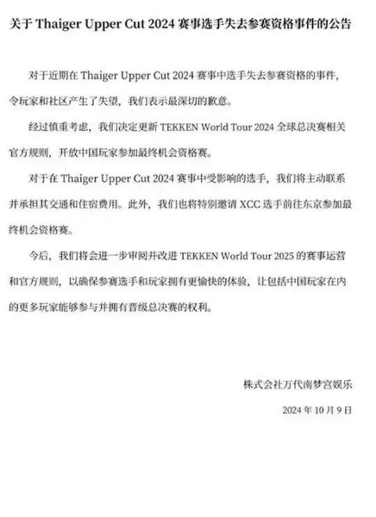 於是在10月9日,萬代南夢宮中國官方發公告致歉。公告表示經過慎重考慮,決定更新相關規則,開放中國玩家參加最終機會資格賽。對於在tgu2024賽事中受影響的選手,萬代南夢宮將主動聯繫並承擔其交通和住宿費用,文中還表示將特別邀請xcc選手前往東京參加最終機會資格賽。