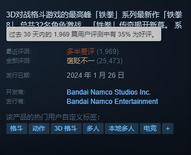 萬代南夢宮電競官方於10月6日發佈公告稱,根據twt2024比賽規定,對於一名“不居住在符合資格國家的選手”,不得不取消其參賽資格。這一行爲引發了玩家的不滿,Steam商店《鐵拳8》頁面的最近評價也呈現爲“多半差評”,不少玩家留言批評,認爲這種行爲是對中國鐵拳比賽選手的歧視。