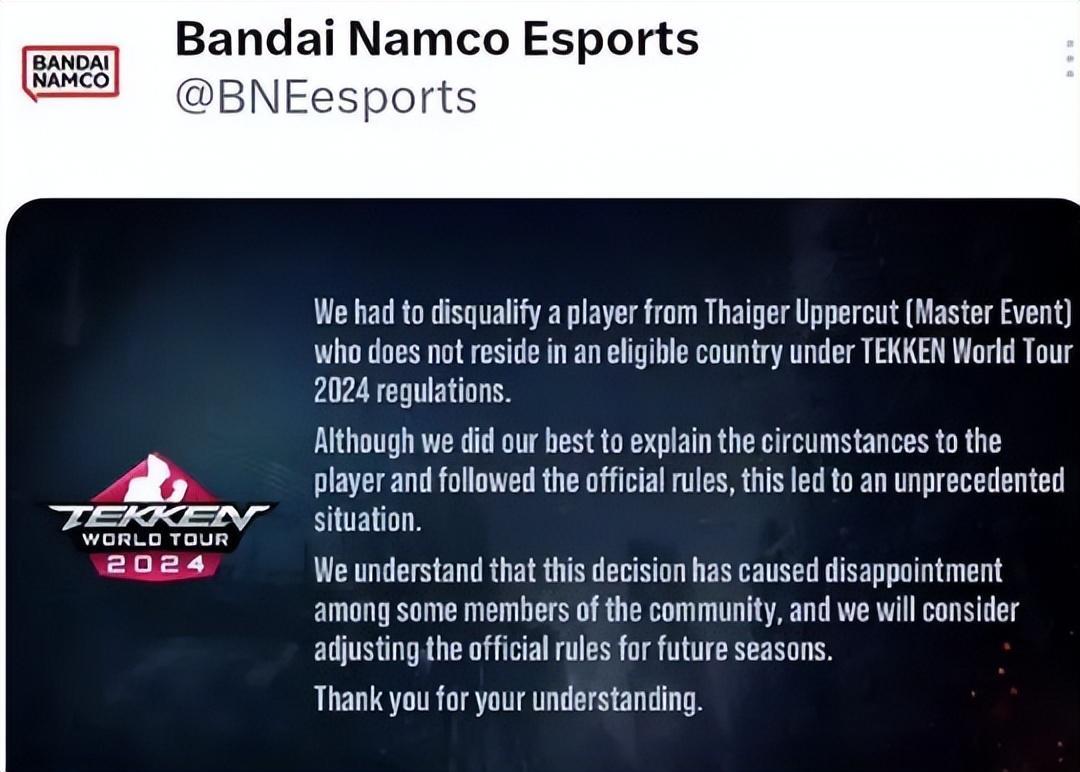 10月4日至6日,tgu2024《鐵拳8》比賽在泰國舉行,中國選手xcc小陳陳成功晉級八強,他卻被工作人員要求棄賽。此前有消息稱,小陳陳在報名比賽時就已被告知中國選手即使獲勝也無法獲得獎金和積分。而就在賽前萬代南夢宮官方人員勸他棄權,經過商議後,小陳陳宣佈放棄參賽資格。