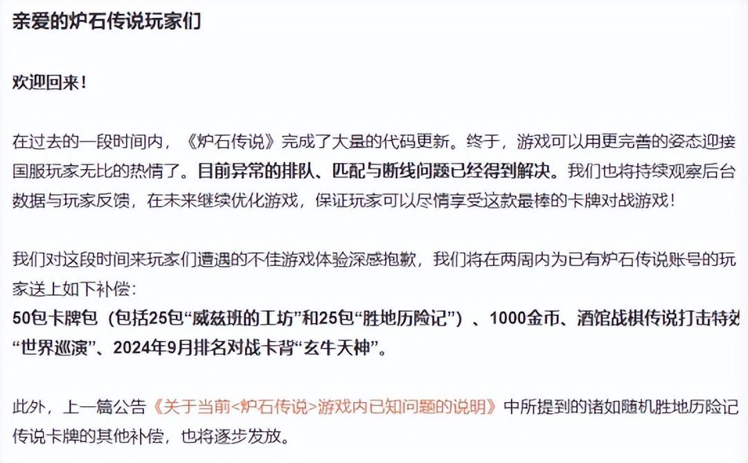 目前異常的排隊、匹配與斷線問題終於得到解決。爲了表達歉意,官方將在兩週內爲已有爐石傳說賬號的玩家送上豐富補償,包括50包卡牌包(25包“威茲班的工坊”和25包“勝地歷險記”)、1000金幣、酒館戰棋傳說打擊特效“世界巡演”、2024年9月排名對戰卡背“玄牛天神”。之前公告中提到的諸如隨機勝地歷險記傳說卡牌等其他補償,也將逐步發放。