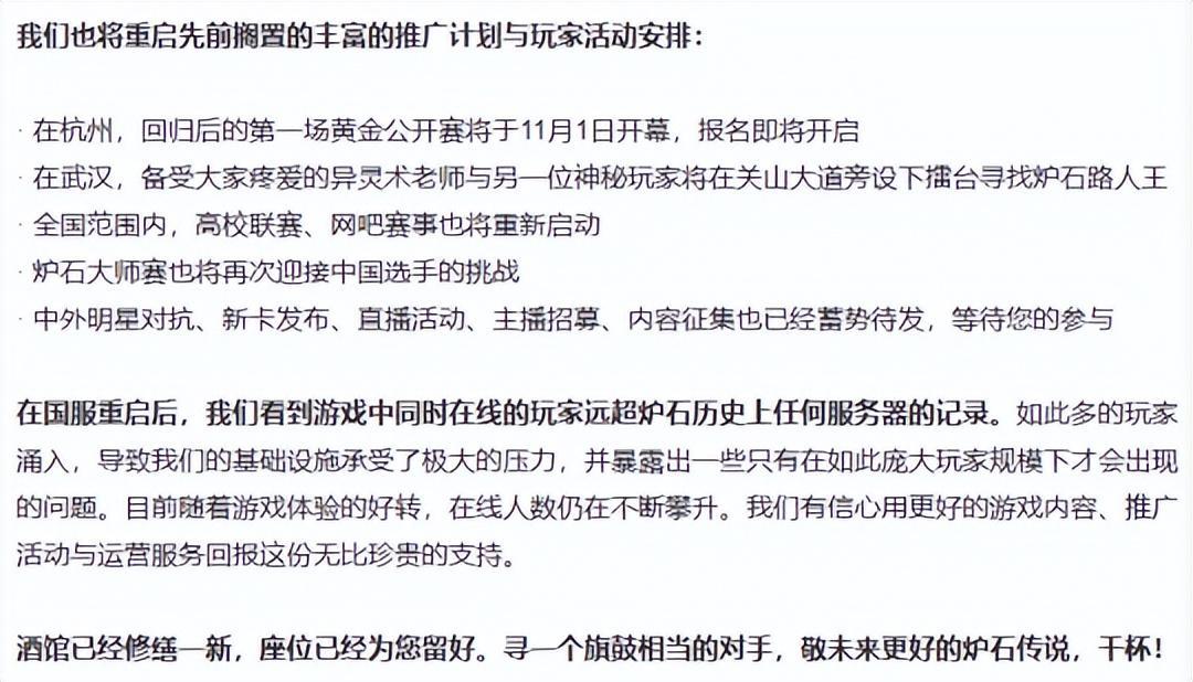 10月10日,爐石傳說官方微博再發公告,表示遊戲服務現已恢復正常。此前大量玩家湧入導致基礎設施承受極大壓力,暴露出一些只有在龐大玩家規模下才會出現的問題。儘管各玩法的匹配時間已較爲正常,但進入遊戲時的異常排隊現象嚴重,連接穩定性也時有波動。