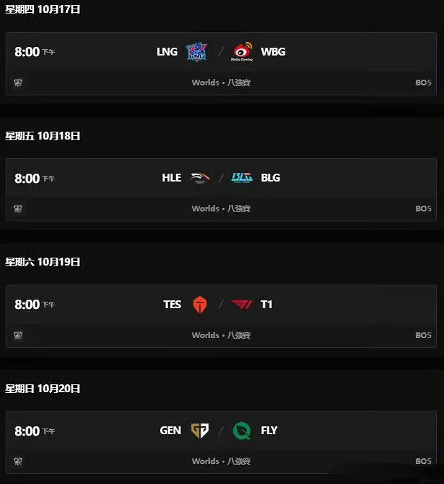 八強賽第一場是WBG和LNG的內戰,將在10月17日(星期四)晚上8點開始。