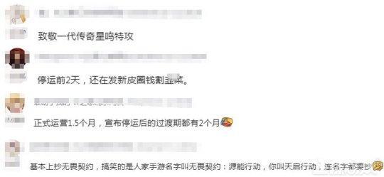 對於《天啓行動》的停運,有網友就調侃,致敬一代傳奇《星鳴特攻》。還有網友吐槽,停運前2天,還在發新皮圈錢割韭菜。還有網友評論,正式運營1.5個月,宣佈停運後的過渡期都有2個月。更有網友直言,基本上抄《無畏契約》,搞笑的是人家手遊名字叫《無畏契約:源能行動》,你叫《天啓行動》,連名字都要抄。