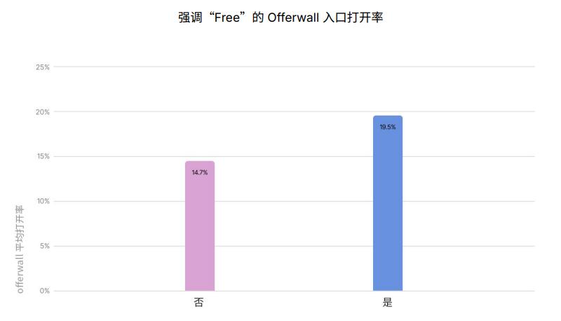 進一步來看,曝光度和貨幣促銷(Currency Sales)是積分牆變現策略成功與否的⾸要因素。舉例來說,那些強調“Free”字樣的積分牆入口,其打開率比未使用類似表述的入口高出 4.8%。因爲用戶行爲漏⽃的起點是整個積分牆變現效果的關鍵基礎,所以保持高打開率至關重要。