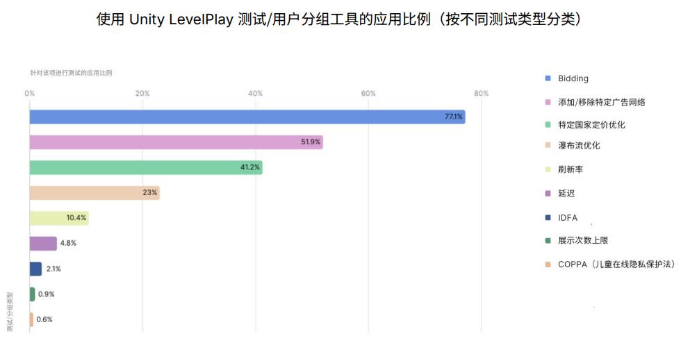 Unity還調查了開發者最常進行的變現策略A/B測試內容,其中Bidding 測試領先(77.1%),開發者通過測試不同的Bidder資源, 以期達到變現最大化;接着是添加或移除特定廣告網絡(51.9%),以及測試針對特定國家的定價策略(41.2%)。
