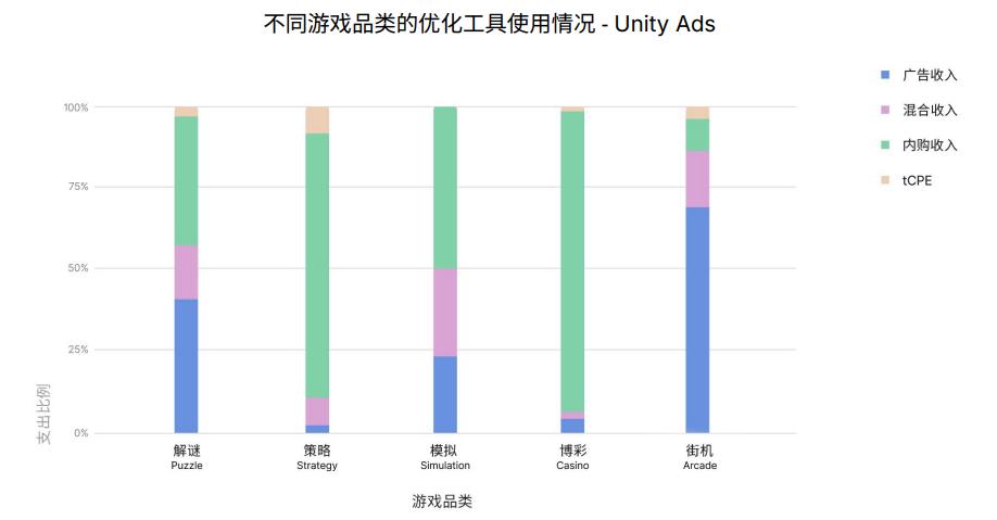 根據 Unity Ads 平臺上的數據顯示,在美國,廣告支出Top 5的遊戲品類都在多個廣告優化策略上進行了預算分配。像 tCPE 這樣的事件驅動型廣告活動,在 Puzzle 解謎(3%)、Strategy 策略(8%)、Casino 博彩(2%)和 Arcade 街機(4%)遊戲中開始出現,表明這些遊戲品類正將他們的獲客策略更加明確地集中在尋找高質量用戶上。