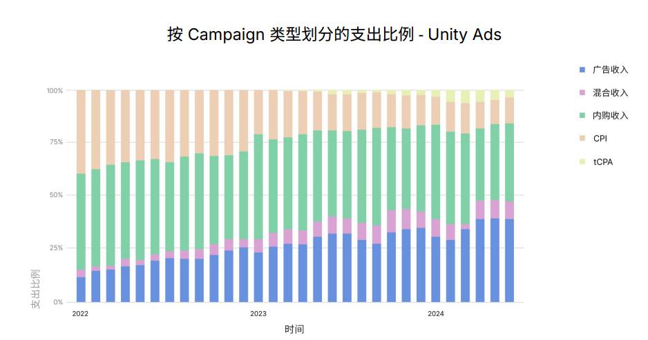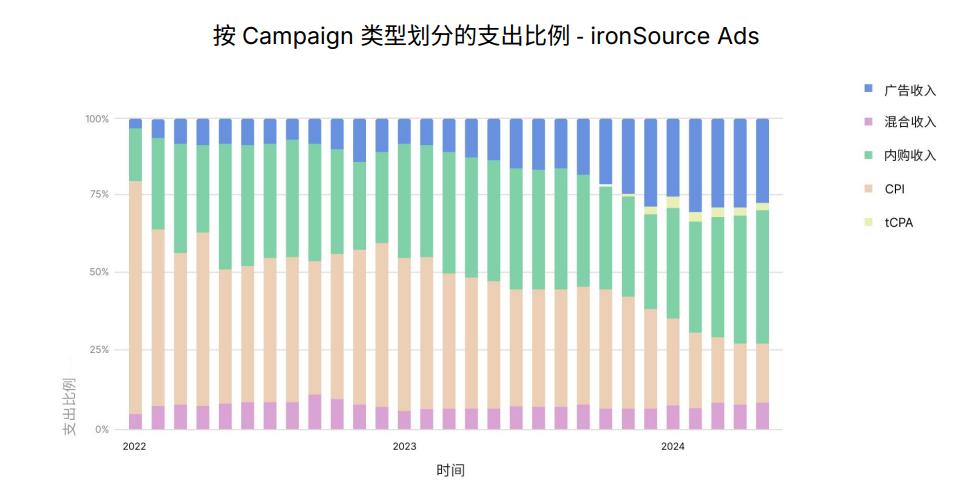 過去兩年,ironSource Ads 和 Unity Ads 上的廣告主們已經通過廣告收入、內購收入和混合ROAS等優化工具,進⼀步多樣化了廣告投放策略,並相應地調整了預算分配。Unity還觀察到,tCPA 事件優化廣告活動越來越受歡迎,這表明廣告主希望進⼀步深入廣告活動,尋找那些更有可能在遊戲中完成特定事件的玩家。