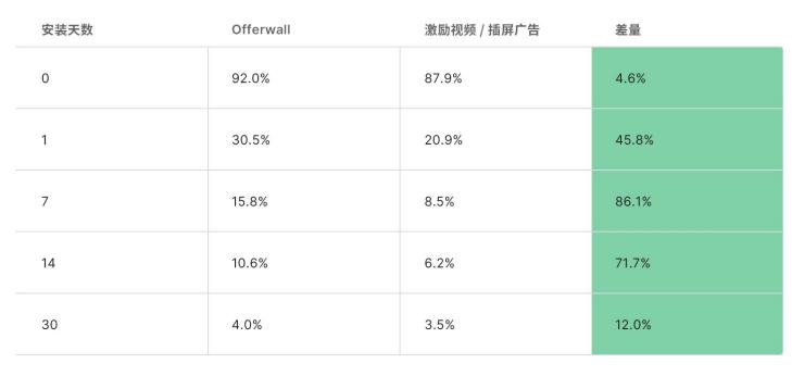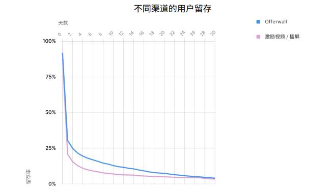 在遊戲前期,通過積分牆獲取的用戶留存率也高於通過其他廣告形式獲得的用戶。與通過激勵視頻和插屏廣告獲取的用戶相比,通過積分牆獲取的用戶D1留存率高出 45.8%,D7留存率高出86.1%,D14留存率高出71.7%。