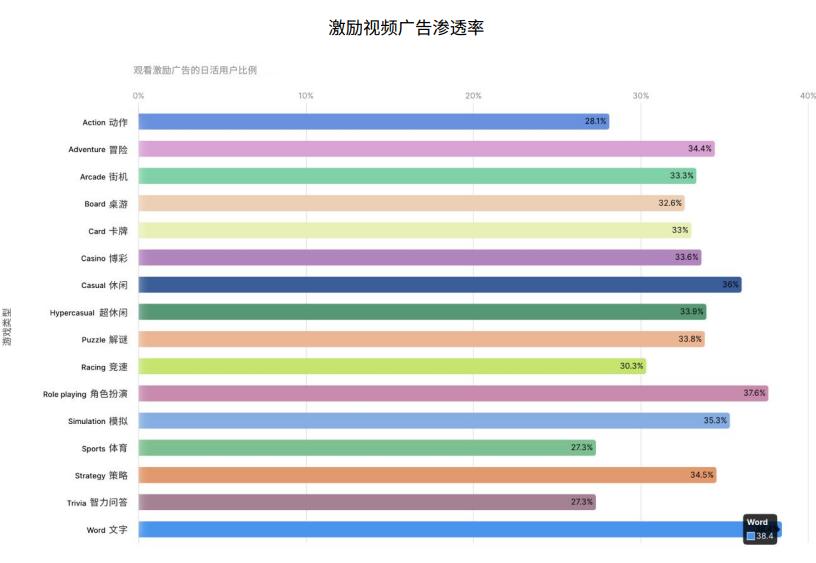 從品類上分析,如下圖顯示,Word 文字(38.4%)、Role Playing角色扮演(37.6%)和 Casual休閒遊戲(36%)是激勵視頻廣告滲透率最高的三個遊戲品類。當然,其他品類的數據其實也非常接近,因此理論上無論開發者的遊戲屬於哪⼀類,都可以通過激勵視頻帶來收益。