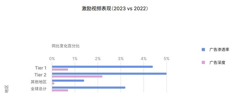 具體以激勵視頻爲例,如今全球範圍內,廣告滲透率的年增長達到了3.2%,如下圖,在T2和T1這類付費能力較高的地區,增長幅度甚至更大。