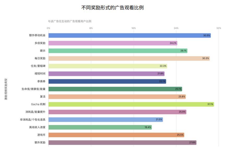 此外,不同獎勵形式的廣告,觀看比例也不一樣。如下圖,Gacha(31.1%)、額外移動機會(30.5%)和每日獎勵(30.3%)帶來的激勵視頻滲透率最高。這可能是因爲 Gacha 的隨機獎勵機制,每次獎勵都不同,更能夠持續吸引用戶;額外移動適時提供了用戶正在尋找的繼續遊戲進程的機會;每⽇獎勵則提供了迴歸遊戲的動力。