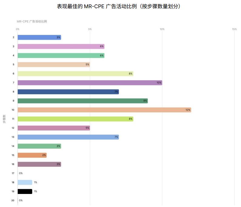 Unity的數據顯示,涉及 7~10 個步驟的 MR-CPE 廣告活動在用戶中尤爲受歡迎。分多個步驟提供獎勵是 MRCPE 的⼀個關鍵優勢。這意味着用戶不必⼀定到達最後⼀步,才能獲得獎勵。相反,用戶在活動過程中即使沒有完成所有步驟,也能夠賺取到獎勵,獲得積極的體驗。