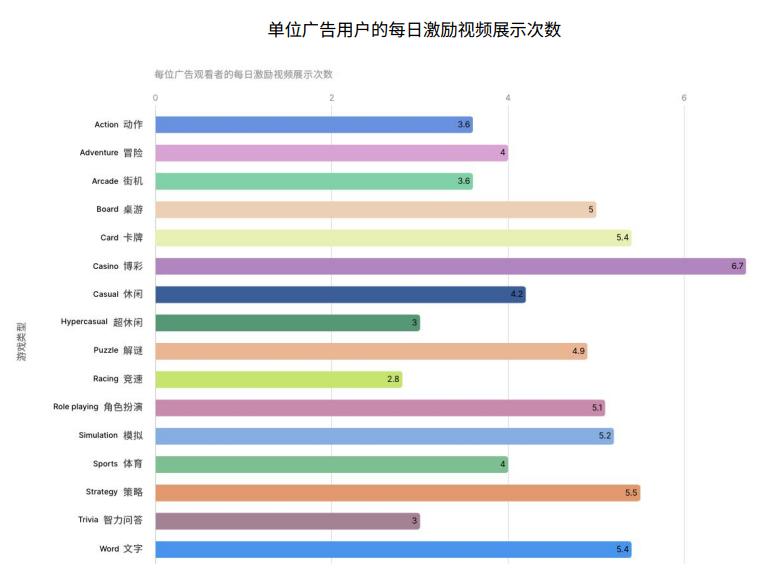 再從觀看量分析,Casino 博彩、Sports 體育和 Word 文字等遊戲品類常常可以推動用戶重複觀看廣告。如下圖中,數值超過5次的品類往往擁有更長的用戶在線時長,但也需要持續提供資源,來推動遊戲進程。