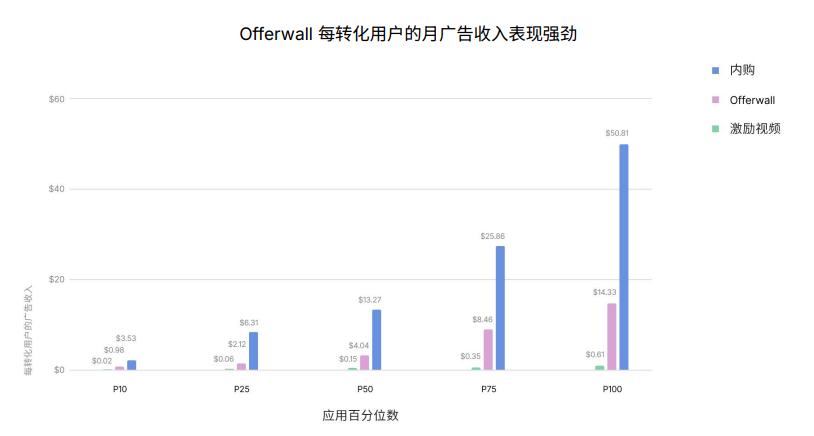 此外,通過積分牆解鎖高級內容,可以降低用戶未來進行內購的門檻。也就是說,開發者將會發現,通過參與積分牆廣告,可以有效延長用戶遊戲時間、建立長期忠誠度、提高廣告 ARPDAU,讓高度參與的非付費用戶體驗他們未來更有可能選擇付費的高級內容,並以此實現對內購和留存率的補充提升。