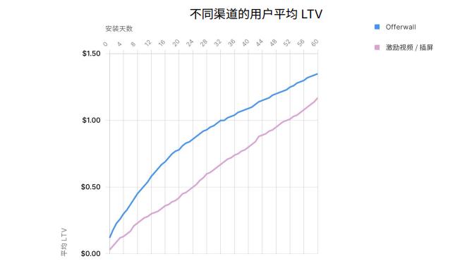 通常來說,與非積分牆用戶相比,通過積分牆獲取和轉化的用戶留存要高出2~7倍。同時,與通過激勵視頻和插屏廣告獲取的用戶相比,通過積分牆獲取的用戶D7-LTV高出100%,D30-LTV高出52.1%,D60-LTV高出15.8%。