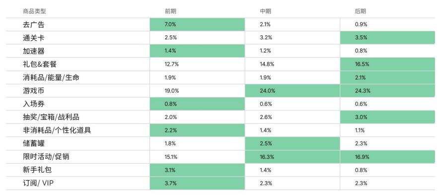 還需要注意的是,根據遊戲階段,不同商品的轉化率各有不同。比如去廣告(7.0%)、訂閱(3.7%)和新手禮包(3.1%)在遊戲前期效果顯著;而遊戲幣(24% 和 24.3%)以及限時活動/促銷(16.3% 和 16.9%)在中後期是強有力的激勵因素。