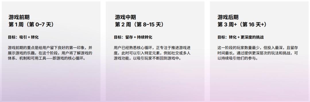內購用戶是⼀個規模小而購買力強大的羣體。在合適的時機提供最有幫助的內購商品,可以帶來巨大的回報。那麼如何做到這⼀點呢?針對這個問題,Unity建議將遊戲內購窗口期分爲前中後三個階段來看,並針對性地優化復購行爲。