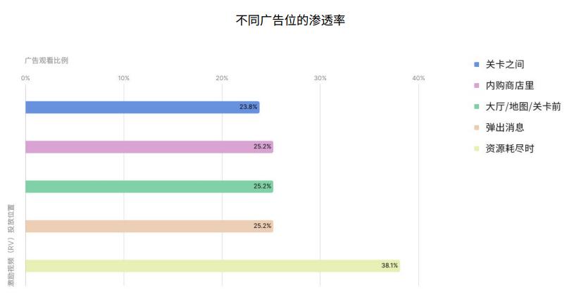 如下圖,當用戶資源(如生命值)耗盡時,情境相關的廣告能夠吸引38.1%的用戶觀看。所以,提供醒⽬、符合當下進度的廣告,在用戶真正需要的關鍵時刻提供獎勵,不僅能帶來較高的廣告滲透率,更重要的能夠打造積極的用戶體驗,長遠看來將帶來更多收益。