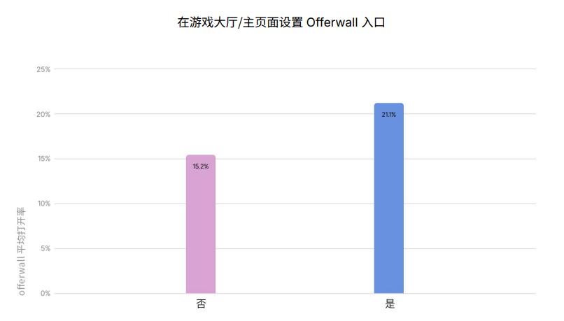 同樣,醒目的積分牆位置也能增加流量。類似於許多遊戲功能,在遊戲 UI 主菜單中的醒⽬位置可以提高滲透率,還能提醒用戶獎勵任務已開放領取。比如將積分牆入口設置在大廳或主界⾯的遊戲,其打開率比沒有類似設置的遊戲高出 5.9%(21.1% vs. 15.2%)。