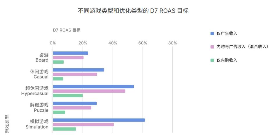 以D7目標爲基準來看ROAS優化工具時,廣告支出較高的遊戲類型主要還是集中在廣告收入優化上,但混合收入優化緊隨其後。