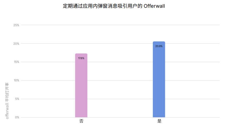作爲貨幣促銷策略的⼀部分,彈窗消息也可以分組觸達特定用戶類型,如休閒用戶和/或非付費用戶等。在設計彈窗時,開發者也應該考慮帶上可直達積分牆的深度鏈接,從而確保用戶點擊彈窗後,能夠直接跳轉至積分牆。使用彈窗引導用戶參與積分牆的遊戲,其打開率比沒有使用彈窗的遊戲高出 3.3%(20.9% 對 17.6%)。