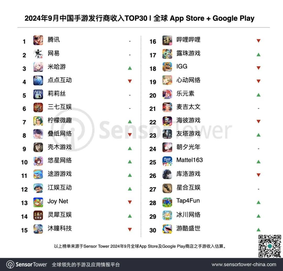 2024年初上線的小隊RPG手遊《王國之歌 Top Heroes》在美國、日本和韓國等主要市場收入快速增長,9月全球收入提升26%,接近1600萬美元,累計收入即將突破1億美元大關。該遊戲的增長帶動發行商江娛互動本期收入提升6%,排名上升至收入榜第12名。