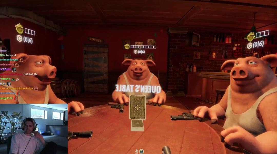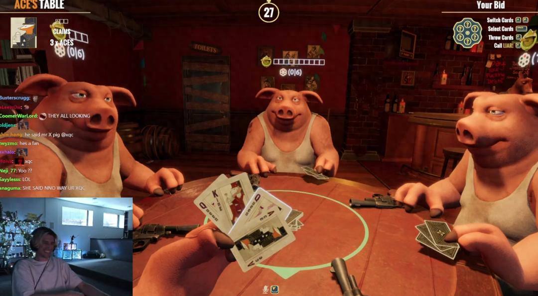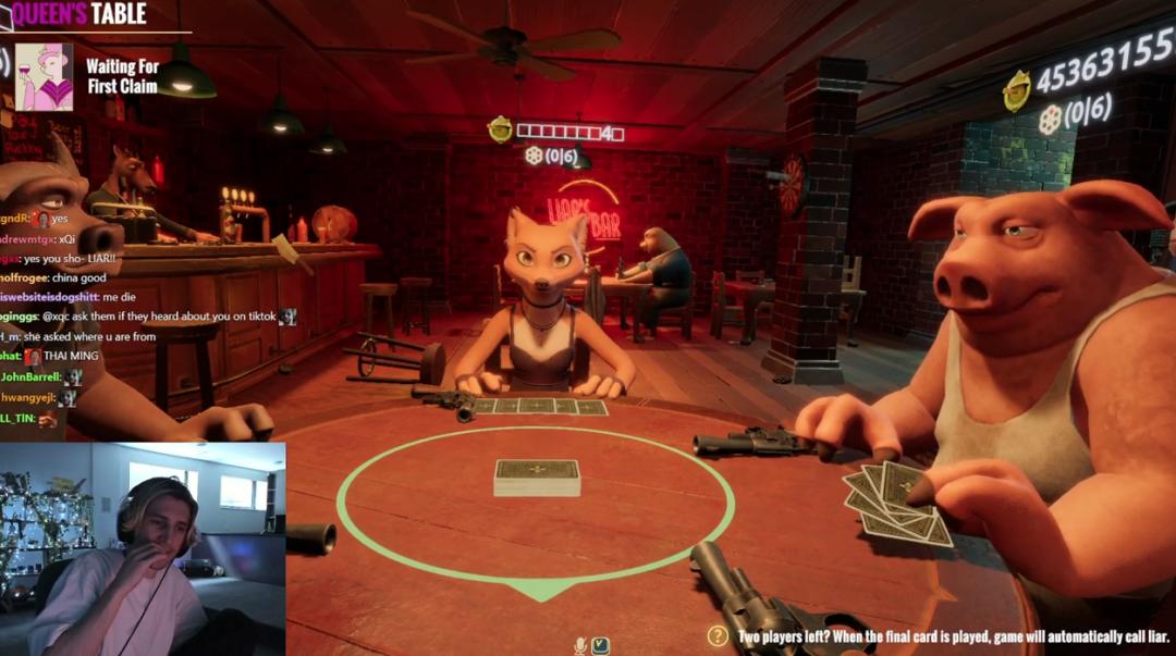 xQc前兩天打開《騙子酒吧》的時候,被彈幕叫去國區玩,第一把就是四個豬頭對弈。xQc興奮得就像第一次見到外國人一樣,在出牌、抿牌的同時不停地用谷歌翻譯現場學中文、跟讀中文。