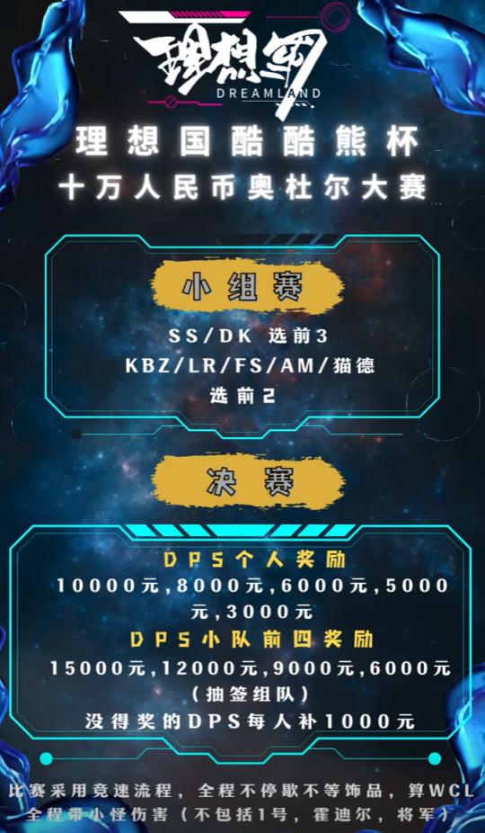 該競速分成小組賽跟決賽兩個階段,玩家報名小組賽需要WCL評分達到98,決賽由小組賽表現出色的選手組成1防騎,1奶騎,1增強薩,1鳥德,1電奶薩,1戰鬥賊,1貓能,1懲戒騎,3術士,2kbz,2獵人,3dk,2法師,2暗牧,3貓德的陣容,看誰的輸出最高。