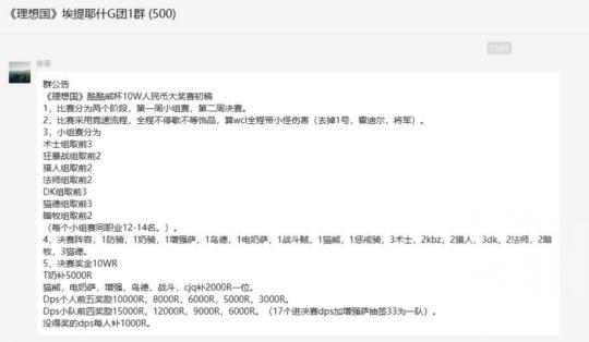 根據網友曬出的聊天紀錄來看,這個民間競速賽全程由一位叫酷酷熊的土豪玩家出資,交給埃提耶什服務器的理想國公會進行組織,採用競速的流程,全程不停歇不等飾品,算wcl全程帶小怪傷害(去掉1號,霍迪爾,將軍),看同職業的選手誰能打出最高傷害。