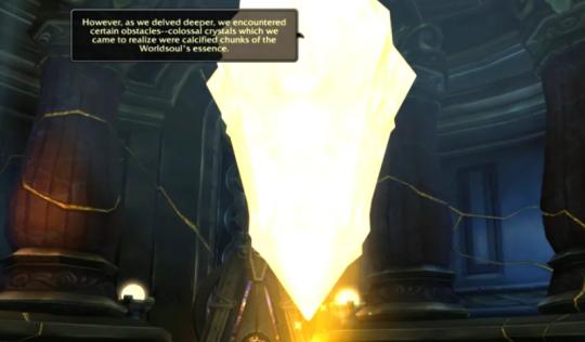 在檔案管理員阿卡迪亞斯與達格蘭·索瑞森二世的對話中,我們能發現早在遠古時期,土靈就在地心挖掘時發現了一些巨大的水晶,通過研究他們認爲這是世界之魂的精華所在,艾澤拉斯想要通過這個東西向外界傳遞一些信息。對此,泰坦專門建造了一個核心通道,讓土靈研究巨大水晶的力量。