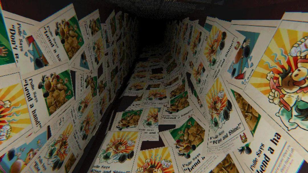 首先,遊戲的演出效果非常意識流,處處都是超現實主義的表現方式。遊戲開始後不久,就是你在飛船過道里行走,牆上是貨運公司的海報。可走着走着,隧道似乎開始變動,一些門被堵住,公司的吉祥物也彷彿在跟蹤你,牆上的海報則越來越多,愈發混亂,同時,你的心跳和飛船引擎的故障聲混爲一體。