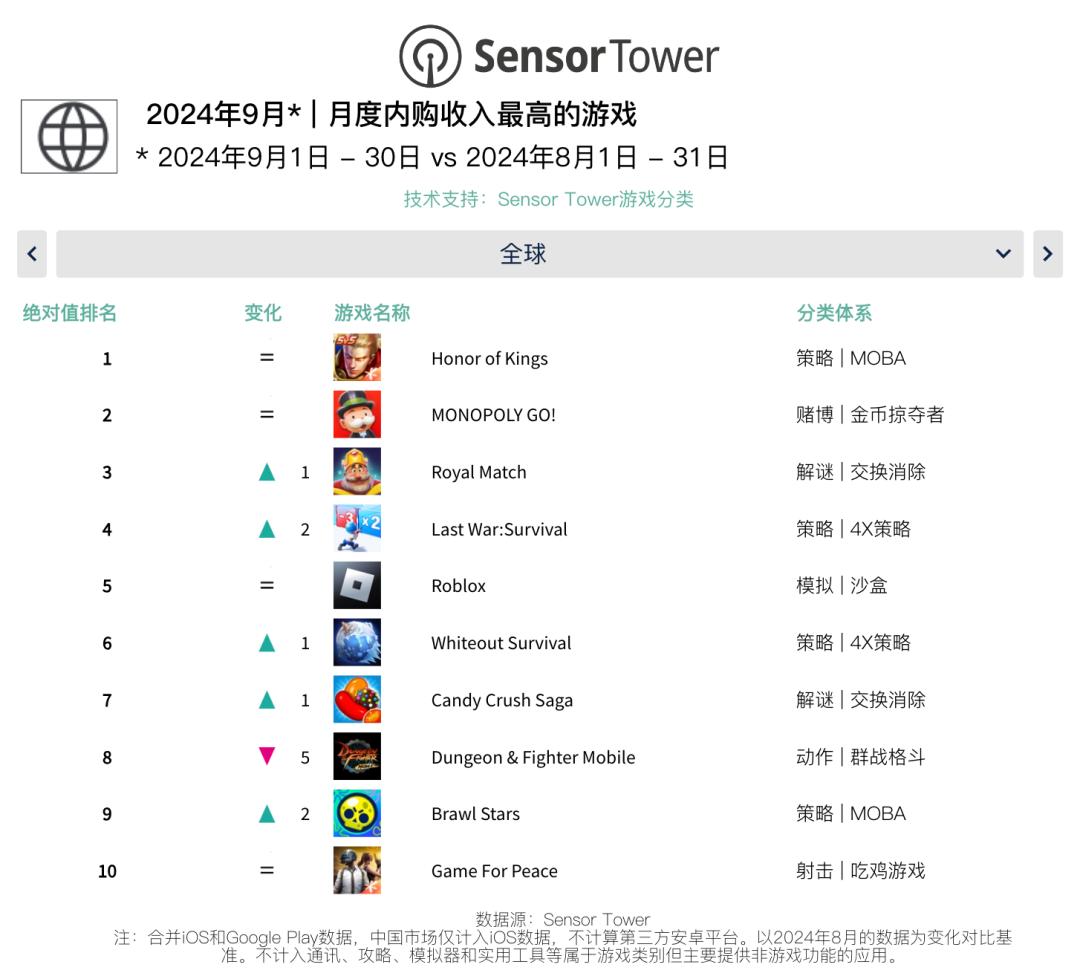 本期收入榜單中,三消益智類遊戲《Royal Match》攀升一位,躋身全球收入排行榜第三位,《王者榮耀 Honor of Kings》與《MONOPOLY GO!》則分別位居收入榜第一和第二的位置。