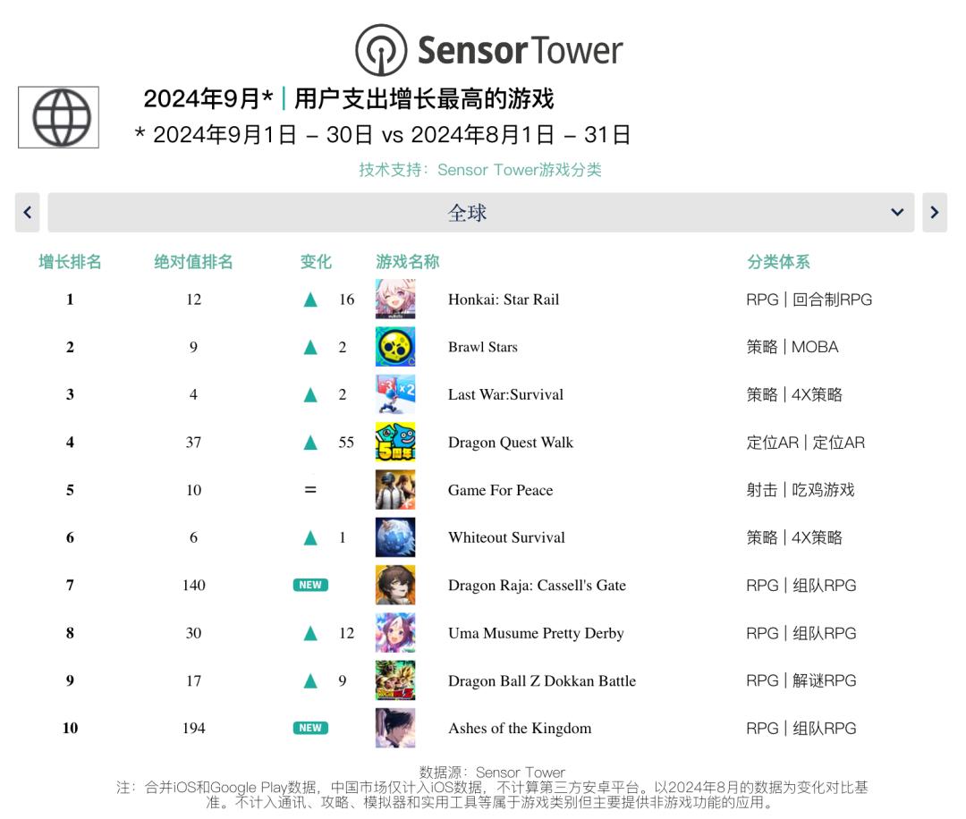 回合制RPG遊戲《崩壞:星穹鐵道 Honkai: Star Rail》位列收入增長排名榜首,其絕對收入排名上升16位至第12位。