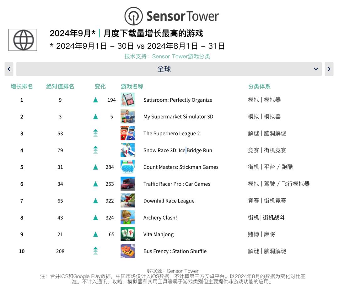 2024年9月的增長排名凸顯了休閒模擬遊戲持久的市場吸引力,前十名的遊戲中有三款屬於此類型。