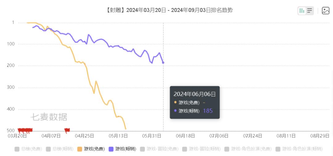 據一位關注過項目的從業者估算,《射鵰》的實際研發成本可能不到十個億,但是截止公測,至少七八個億的消耗是一定有的。然而在今年3月28日公測之後,《射鵰》最高也只登上了iOS遊戲暢銷榜第15位,此後則是一路下滑。