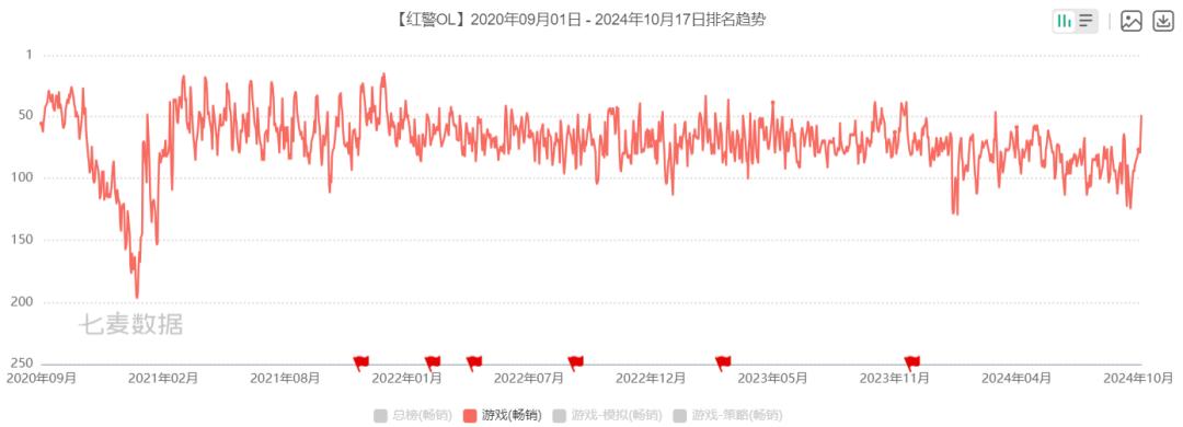 能在這樣的環境裏穩住陣腳的產品,多少都摸索出自己的絕活。其中《紅警OL》就是一個獨特的案例,從榜單走勢來看,在上線初期的熱度迴歸穩定後,這款產品還經歷了其他SLG沒遇到過的短期陣痛,但往後的幾年,《紅警OL》快速翻身進入穩定的長線發展期。