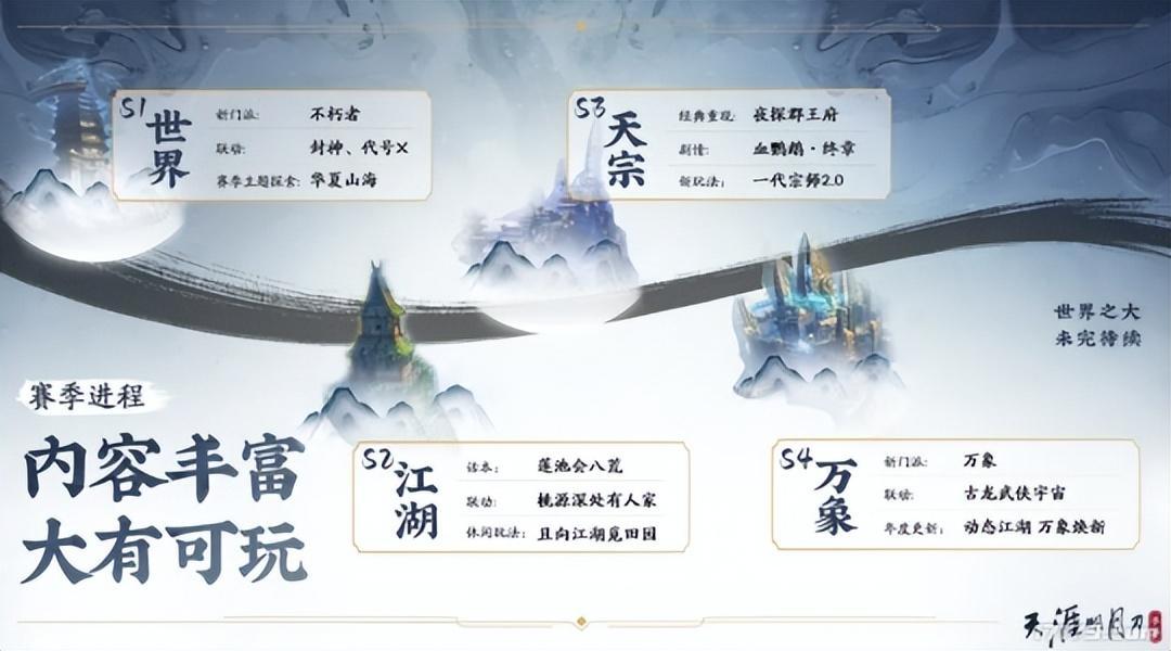副本關卡則會保留天刀原本的風味,第一賽季玩家可前往「天涯鎮」、「黃泉」、「天宮」、「大羅天」話本,更有懷舊話本待開放。