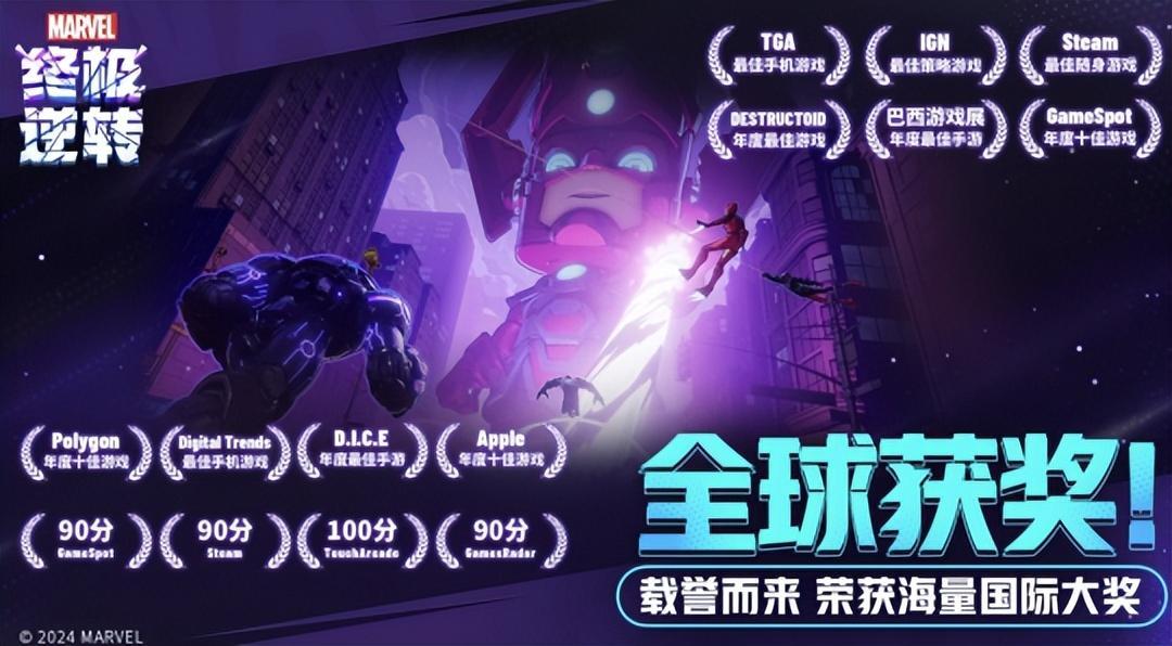 《漫威終極逆轉》在上線第一年就拿下了“TGA年度最佳移動遊戲”、“IGN最佳策略遊戲”、“DICE年度最佳手遊”、“Apple創新思維設計”等多個大獎。遊戲上線後不久就便衝上50+國家地區的App Store免費榜Top10,在全球範圍內擁有數千萬玩家。
